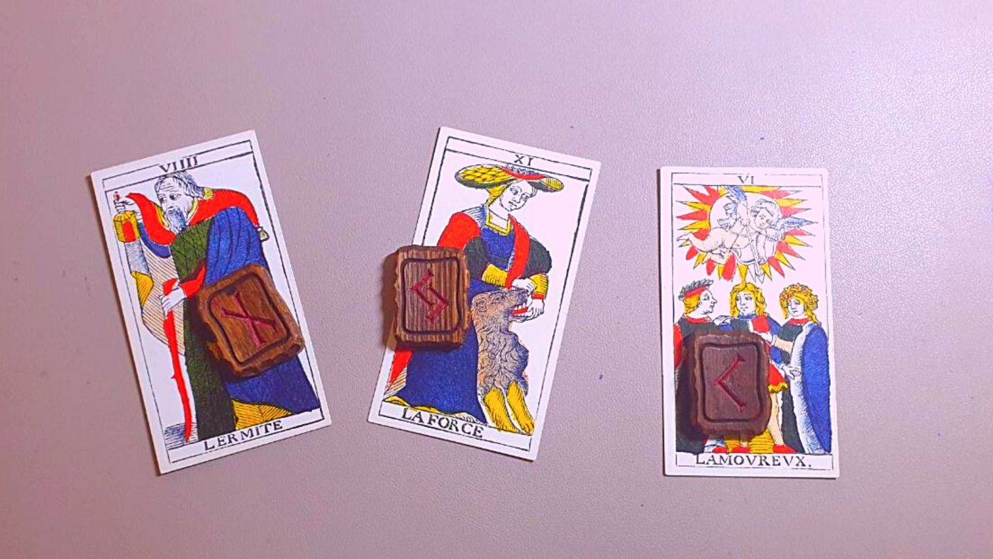 Questi due sistemi che permettono di indagare l’animo umano e il suo coinvolgimento con la materia del mondo quotidiano nella loro struttura presentano archetipi vestiti di segni, le Rune, e di immagini, i Tarocchi. L’archetipo è per definizione non solo un principio primo da cui tutto ha avuto inizio ma anche un principio ultimo a cui si tende a ritornare, per realizzarlo definitivamente. D’altronde i più attenti studiosi e ricercatori di questi due sistemi hanno intravisto la legge dell’ottava regolare il loro succedersi e proprio attraverso di essa che i due sistemi trovano una similitudine nella loro organizzazione numerologica. A ogni runa corrisponde un Arcano maggiore dei Tarocchi tranne per uno a cui ne corrispondono tre […] quindi nel momento in cui andremo a fare una stesa con le rune avremo una stesa corrispondente con i tarocchi e viceversa. Facciamo un esempio: dal sacchetto di rune dopo aver posto la domanda: cosa hanno da dirmi le rune riguardo a questa connessione (con i tarocchi)? Sono uscite Nauthiz ᛅ Jera ᛃ e Kenaz ᚲ a queste corrisponderebbero l’Eremita, la Forza e l’Innamorato. La stessa runica ci risponde: il destino individuale che le Norne scrivono con le Rune può essere rivisto nell’antico sapere cristallizzato nelle carte dei tarocchi. Analogamente ma con sfumature diverse i tarocchi corrispondenti dicono: nella saggezza che proviene dal vissuto, l’intuizione derivante dal dominio della materia porta alla luce la relazione che trova la sua apoteosi nell’unione. Come nella stessa runica abbiamo Jera che funge da collegamento tra i due sistemi (nauthiz e Kenaz), così nei tarocchi è l’innamorato che spiga la connessione trai due sistemi. Gli Arcani grazie alle immagini permettono un’interpretazione più “romanzata” mentre le rune sono precise quanto una lama affilata.